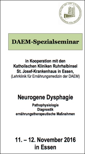 Da das DAEM-Spezialseminar „Neurogene Dysphagie“ im vergangenen Winter erfreulicherweise so erfolgreich angelaufen ist, wird es im kommenden November (11.- 12.11.2016) erneut in Essen stattfinden.